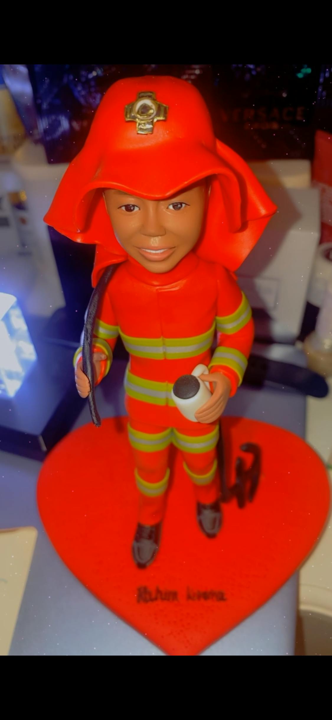Aangepaste bobblehead in rood werkuniform met koffiekopje